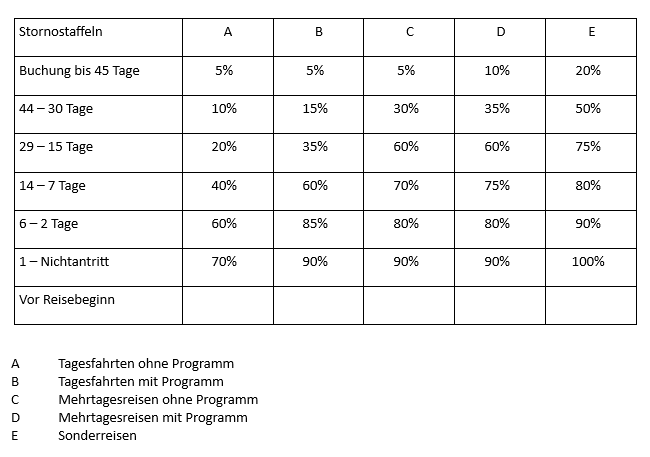 SR hat die nachfolgenden Entschädigungspauschalen unter Berücksichtigung des Zeitraums zwischen der Rücktrittserklärung und dem Reisebeginn sowie unter Berücksichtigung der erwarteten Ersparnis von Aufwendungen und des erwarteten Erwerbs durch anderweitige Verwendungen der Reiseleistungen festgelegt. Unter Beachtung des Zeitpunkts des Zugangs der Rücktrittserklärung des Kunden bei SR wird die pauschale Entschädigung wie folgt mit der jeweiligen Stornostaffel berechnet.